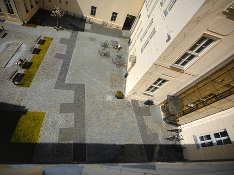 Nádvoří „Křížkárny“ je samo o sobě příjemné místo, kde si zamyšlení nad proměnlivostí dějin můžete vychutnat při posezení na lavičce u kašny s dobrou kávou nebo něčím na zub z přilehlého univerzitního bistra FreshUP. A když se zrovna nepřednáší, můžete nahlédnout do zdejší auly a prohlédnout si velkou mozaiku od významného architekta a umělce Lubomíra Šlapety. Zachycuje panorama Olomouce ve 40. letech minulého století – obdobné panorama, jaké dnes můžete naživo obdivovat třeba od naší Lékařské fakulty.